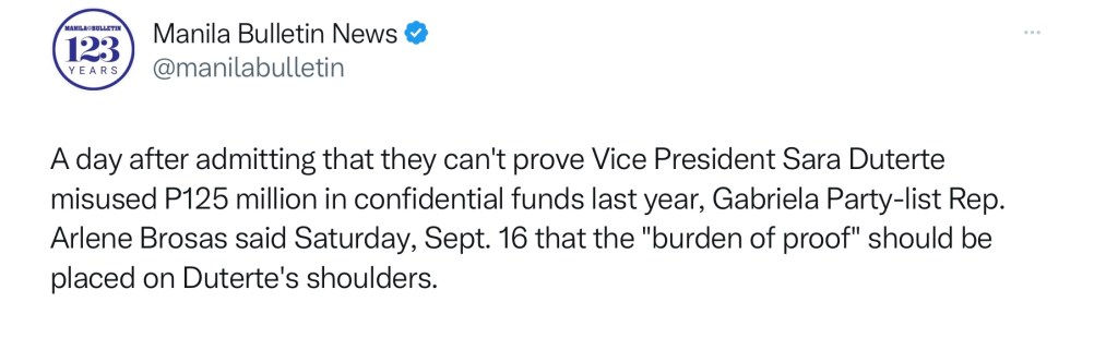 Then Brosas turns around and says the burden of proof should be placed on Sara Duterte’s shoulders.