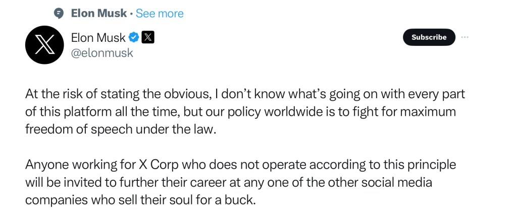 In a post, Twitter (now X) owner Elon Musk reaffirmed his commitment to free speech and vowed to fire his employees who do not subscribe to this basic principle.