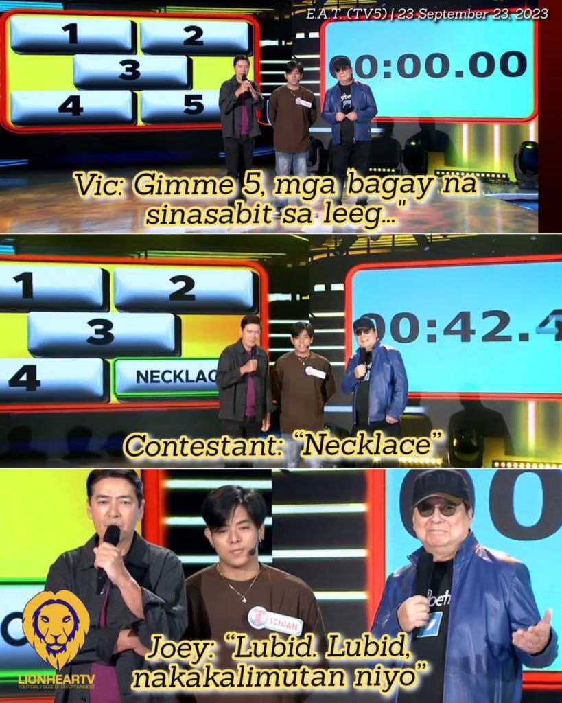 When contestants were asked to name things people hang around their necks, de Leon chimed in with, “Lubid, lubid!” (a rope, a rope). Clearly, he’s dishing out a different kind of ‘rope soup’ that only he can stomach.