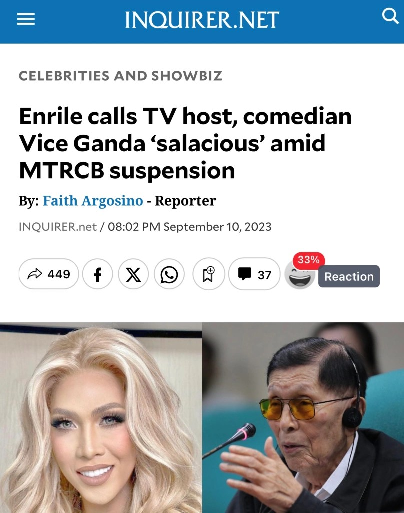 But let’s be real, that’s like trying to fight fire with more fire. In all likelihood, the appeal will end up on the desk of Presidential legal counsel Juan Ponce Enrile, who, in a stunning display of profound insight, previously labeled the show’s host, Vice Ganda, as “salacious.”