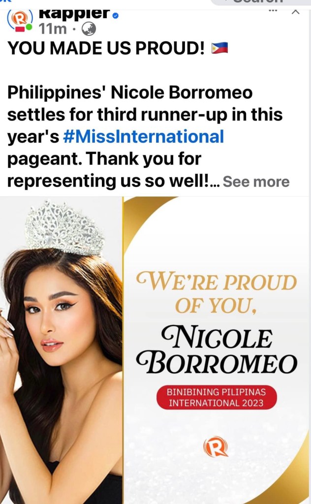 MANILA, Philippines (The Adobo Chronicles, Manila Bureau) – Rappler, the least-trusted news brand in the Philippines, may have uncovered an illegal, negotiation scheme at the Miss International Beauty Pageant. This after the convicted criminal, Maria Ressa-owned online news portal accused the country’s representative to the pageant Nicole Borromeo of “settling” for the position of third runner-up. We wonder why she didn’t settle for the crown. Perhaps she was short of funds?