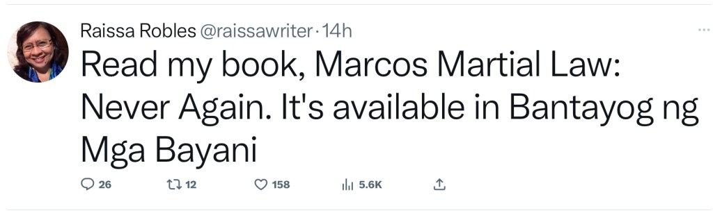Ah, Raissa Robles, the self-proclaimed historian with an imaginary flair for storytelling. Her desperate attempts to salvage her flop of a book on the Marcos Martial Law era are nothing short of comical.