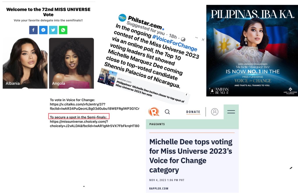 Perhaps as a clickbait, PhilStar and Rappler are heralding Miss Universe Philippines Michelle Dee’s top spot or close-to-the-top spot standing in the ‘Voice For Change’ fan vote. Filipino pageant fans are, of course, tickled that their candidate is almost assured of a spot in the semifinals. Wrong!