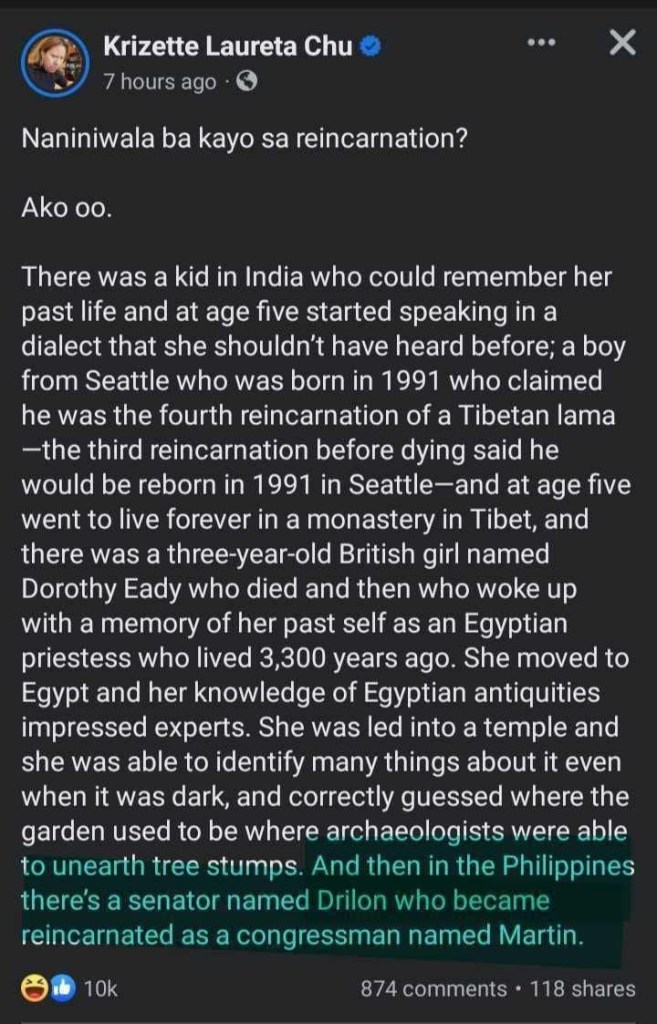 In the vast realm of online enlightenment, blogger Krizette Laureta Chu has taken a spiritual detour, advocating for the reincarnation of public figures with the finesse of a fortune teller who misplaced her crystal ball.