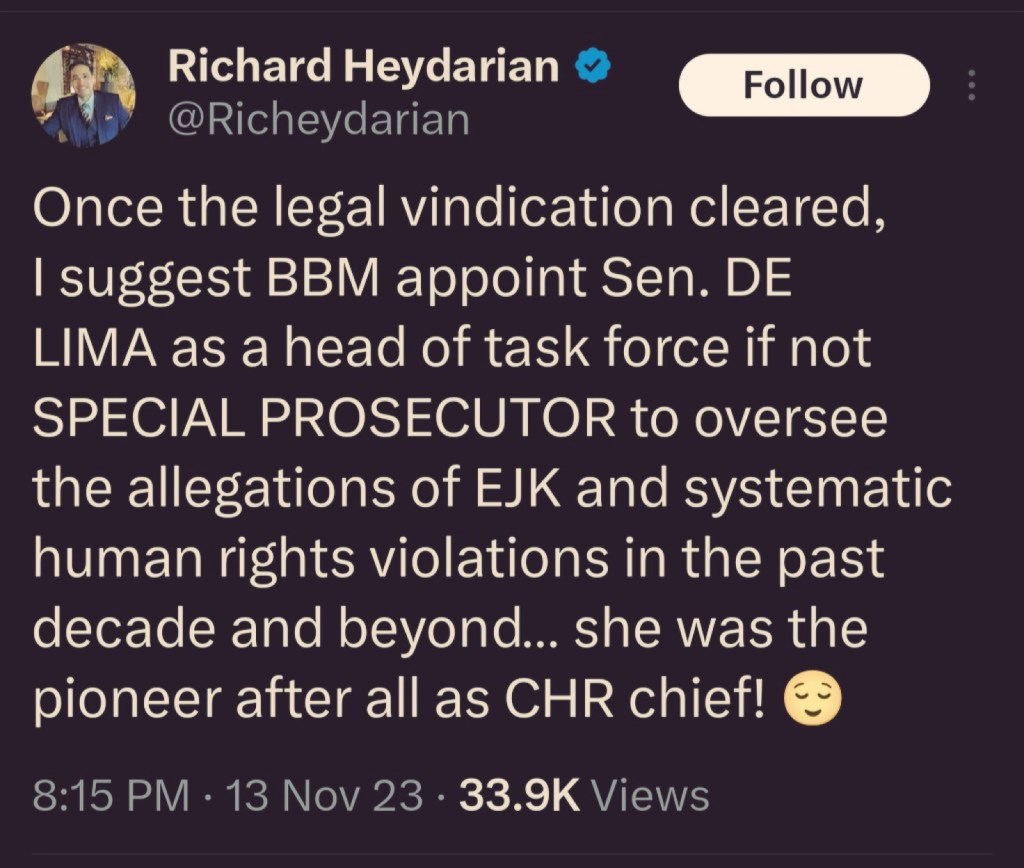 Richard Heydarian, the maestro of eyebrow-raising proposals, has graced us with another gem—President Bongbong Marcos appointing Leila de Lima to investigate alleged extra-judicial killings.
