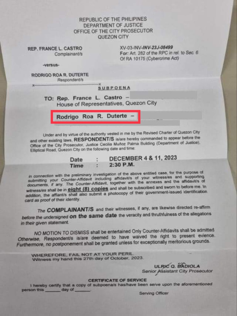 QUEZON CITY, Philippines (The Adobo Chronicles, Quezon City Bureau) – The Office of the Prosecutor of Quezon City has issued a subpoena to former President Rodrigo Duterte in connection with a complaint filed by Representative France Castro for grave threats.