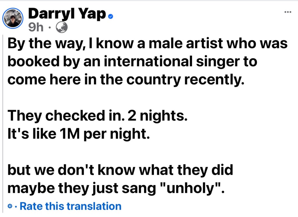 In a recent social media post, Yap proudly unveiled the supposed escapades of a male artist allegedly booked for a two-night tryst at a Philippine hotel by a famous international personality.
