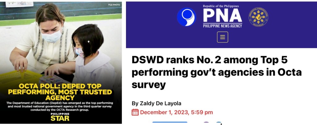 In a confusing twist of priorities, the Philippine News Agency (PNA) recently proclaimed the Department of Social Welfare and Development (DSWD) as the second-best government agency, according to an OCTA Research poll. One might wonder what happened to the headline that the Department of Education (DepEd) secured the top spot. Is the PNA, generously funded by Filipino taxpayers, harboring a mysterious beef with Vice President and DepEd Secretary Sara Duterte?