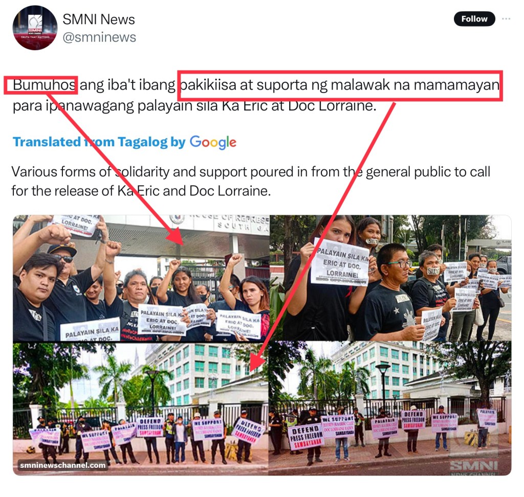 The network boldly proclaimed an overwhelming public outcry for the release of detained SMNI talents Lorraine Badoy and Ka Eric. The evidence? A carefully spliced photo collage featuring the same dozen or so people protesting – a number that evidently equates to a nationwide uproar.