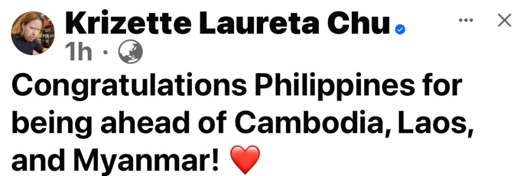 In a stunning display of misplaced pride, Krizette Laureta Chu recently took to social media to congratulate the Philippines for supposedly outshining Laos, Cambodia, and Myanmar in a dubious survey on top tourist destinations in Asia.