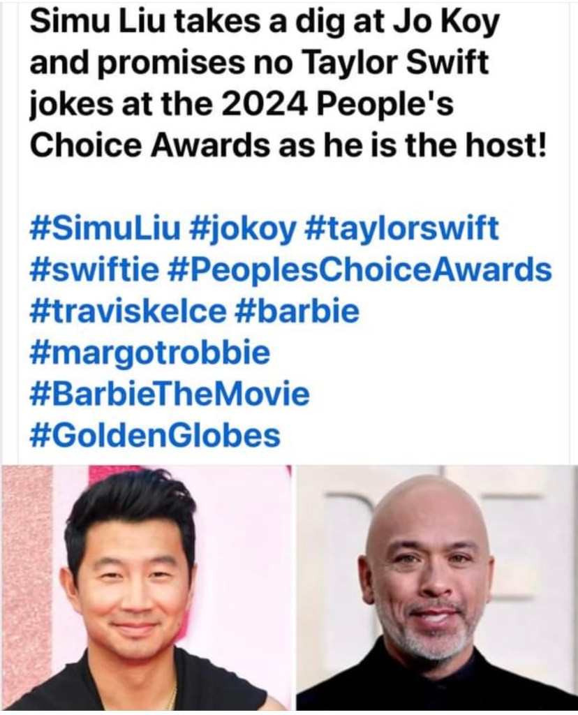 Actor Simu Liu, the beacon of comedic enlightenment, has graciously spared us from the perilous territory of Taylor Swift jokes when he hosts this year’s his People’s Choice Awards. He seems to have taken a swipe at Filipino American comedian Jo Koy whose hosting of the Golden Globes was marred by a joke on the NFL courtesy of Swift.