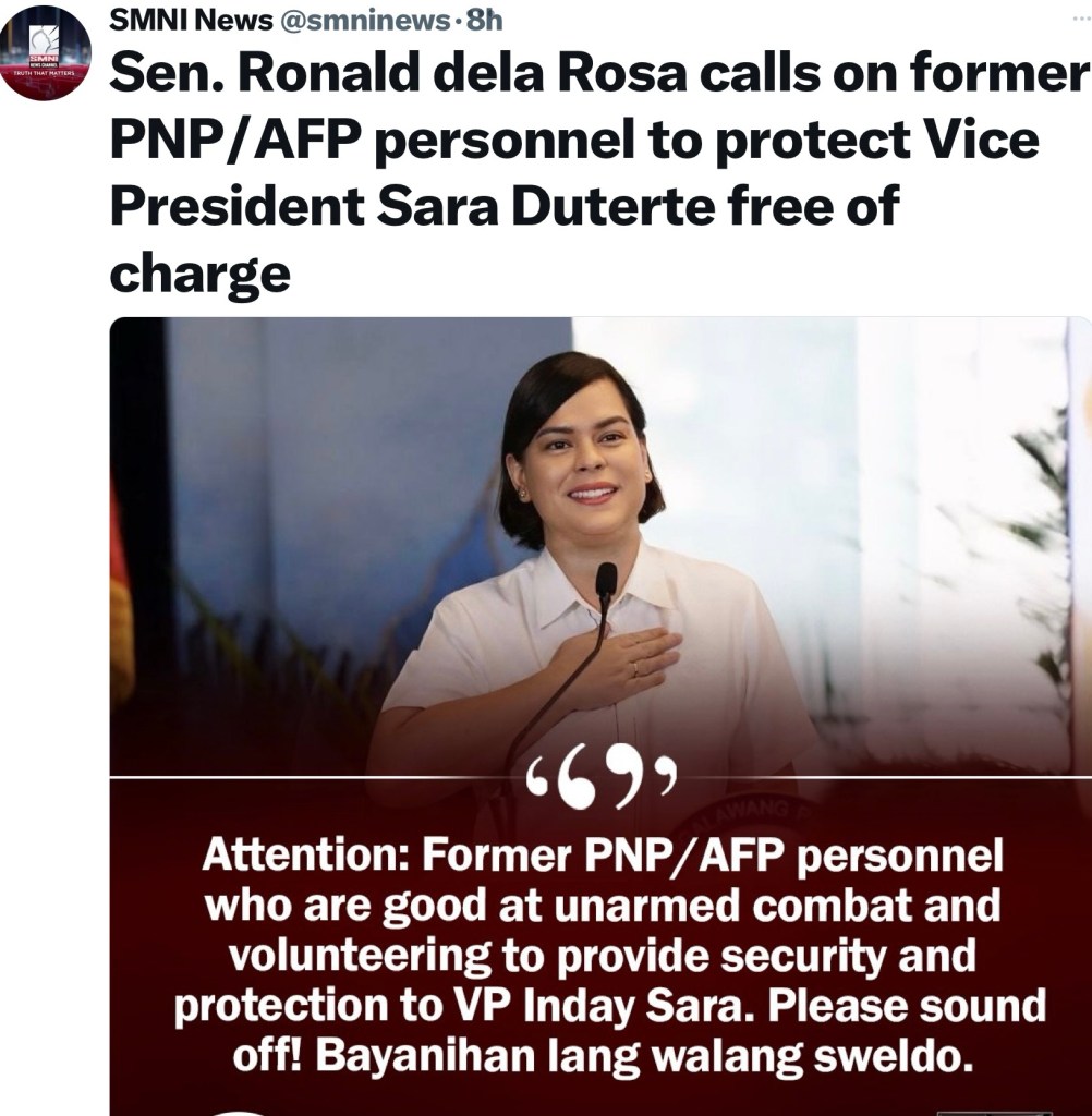 Senator Bato dela Rosa has once again proven his knack for bold, innovative ideas by urging police and Armed Forces retirees to volunteer as a security detail for Vice President Sara Duterte.