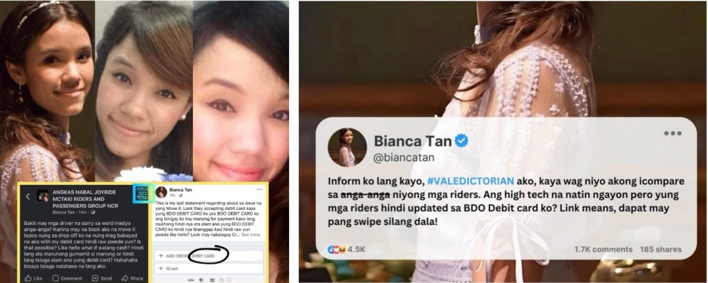 Bianca Tan, our illustrious valedictorian, recently voiced her dismay when a humble motorcycle rider refused her grandiose offer of payment via debit card.