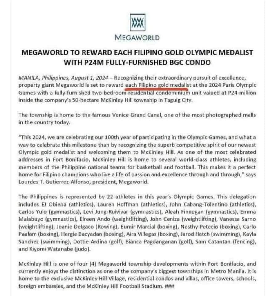However, the abundance of gifts has sparked some necessary clarifications. Megaworld, in a move both generous and frugal, has clarified that their P24M luxury condo gift is awarded per gold medalist, not per gold medal. Thus, despite Yulo’s double triumph, his condo count remains singular.