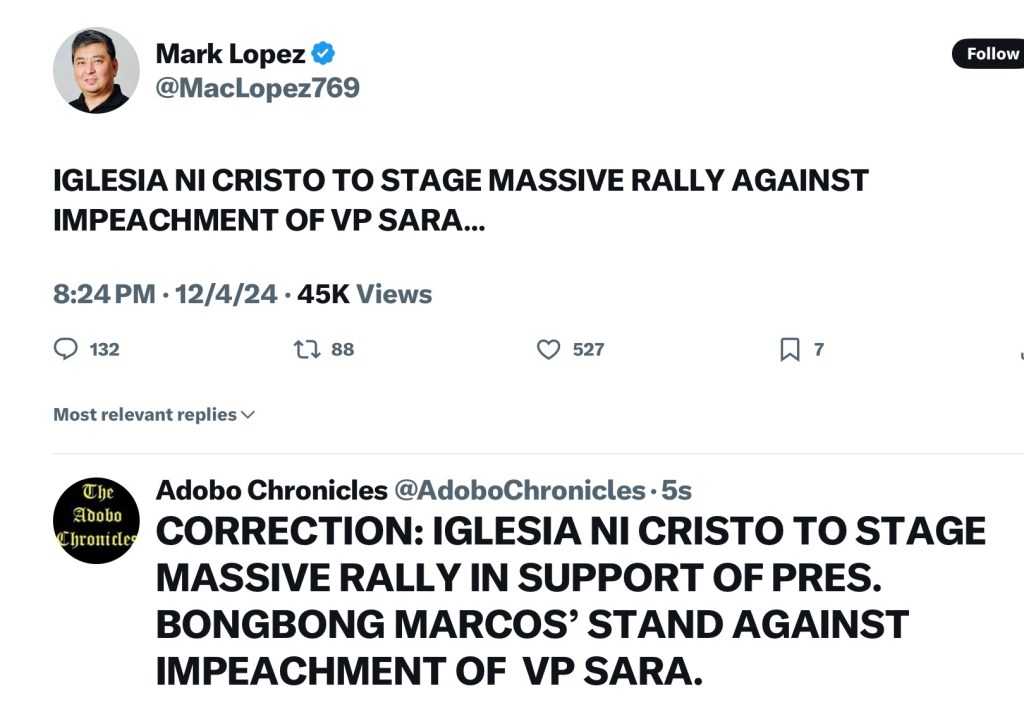 In his latest caps-locked magnum opus, he boldly proclaims that the Iglesia Ni Cristo (INC) is rallying nationwide against VP Sara Duterte’s impeachment. Conveniently, he omits the part where the INC aligns with President Bongbong Marcos’ stance against the same impeachment. But why spoil a perfectly good narrative with the full picture, right? Half an apple is all he needs to stage his twisted feast for the gullible.Lopez’s selective storytelling is almost poetic. It’s like watching a magician who reveals just enough of the trick to dazzle the audience but keeps the sleight of hand out of sight.