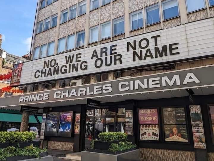 While other establishments have changed names, say from “Her Majesty,” to “His Majesty, and the national anthem has been updated to “God Save the King,” the Prince Charles Cinema, located on 7 Leicester Pl in London, is standing its ground.