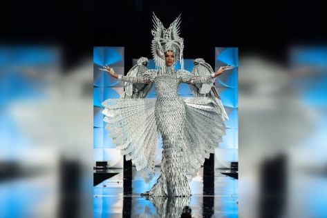 As soon as Gazini Ganados stepped on stage as part of the National Costume Competition, she realized she may have worn the wrong attire. She appeared in an over-the-top silver gown, complete with headdress and a silver eagle on either shoulder,