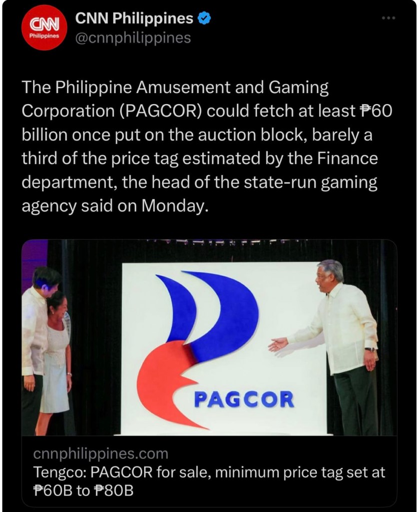 MANILA, Philippines (The Adobo Chronicles, Manila Bureau) – The Philippine Amusement and Gaming Corporation (PAGCOR) is up for privatization, as officials say the sale of the agency could, at best, fetch P60-P80 billion!