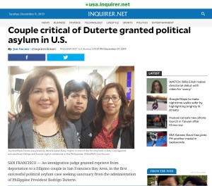 SAN FRANCISCO, California (The Adobo Chronicles, San Francisco Bureau) – An immigration judge granted reprieve from deportation to a Filipino couple in San Francisco Bay Area, in the first successful political asylum case seeking sanctuary from the administration of Philippine President Rodrigo Duterte.