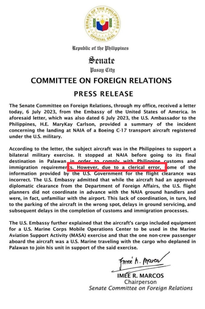 In the press release, Senator Imee Marcos said that the U.S. Embassy had admitted “clerical error” in the failure to obtain proper documentation for the landing.