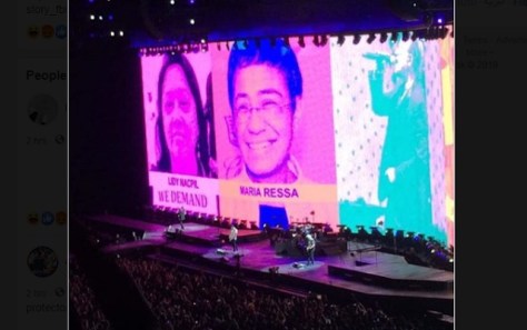 MANILA, Philippines (The Adobo Chronicles) – It is being reported on social media that Bono and U2 were booed by members of the audience during a concert held last weekend at the Mall of Asia Arena in Manila. The reason? Bono dedicated the song, “Ultra Violet” to Rappler CEO Maria Ressa and flashed her face on the giant screen. He reportedly told the audience to “be like Maria Ressa.”