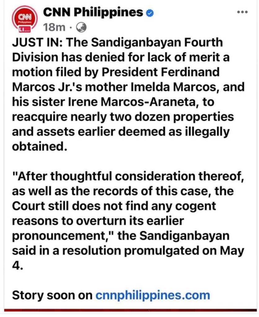 MANILA, Philippines (The Adobo Chronicles, Manila Bureau) – Following the denial by the Sandiganbayan of a motion by Imelda Marcos and Irene Marcos-Araneta to reacquire some two dozen properties and assets earlier deemed as illegally acquired, Maria Ressa, Raissa Robles and the women’s group Gabriela filed a motion for reconsideration in favor of the Marcoses.