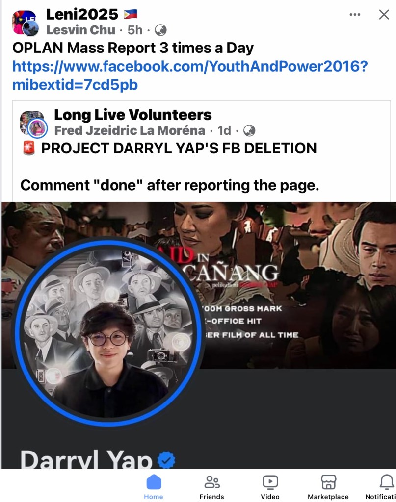 Now that Labador’s TikTok, Facebook, Google and Twitter accounts have been taken down, a netizen group calling itself Leni2025 is asking its members to mass-report Yap and all his pro-Marcos film projects. It even has adopted an OPLAN (Operations Plan) called “Mass Report 3 times a day.”