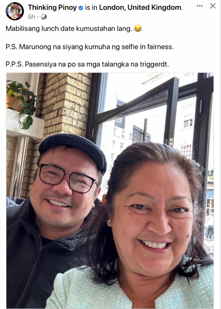 LONDON, United Kingdom (The Adobo Chronicles, London Bureau) – Sometimes, to get to the top, you have to hob-nob with those at the top. This seems to be the modus operandi of vlogger RJ Nieto, a.k.a. Thinking Pinoy as many have noticed he has been socializing with First Lady Liza Araneta Marcos. The FL has been rumored to have a say in appointments made by this administration.