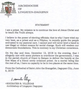 In a signed statement, Villegas denied being at a meeting on December 12, 2018 with the plotters, saying he was delivering a homily at the first mass of a newly-ordained priest friend.