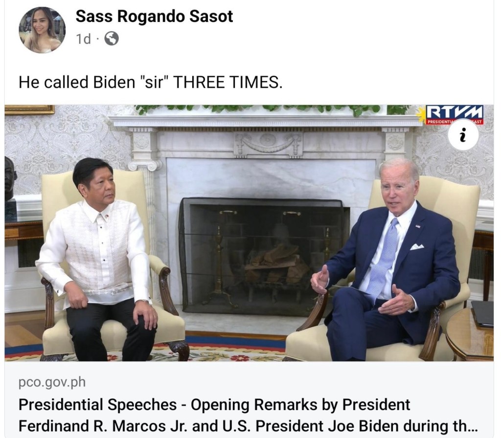 WASHINGTON, D.C. (The Adobo Chronicles, Washington Bureau) – Netherlands-based vlogger Sass Rogando Sasot found it a big deal when Philippine President Bongbong Marcos called U.S. President Joe Biden ‘sir’ three times when the two heads of state met at The White House this week. She didn’t state her reasons, but all the insinuations are there.